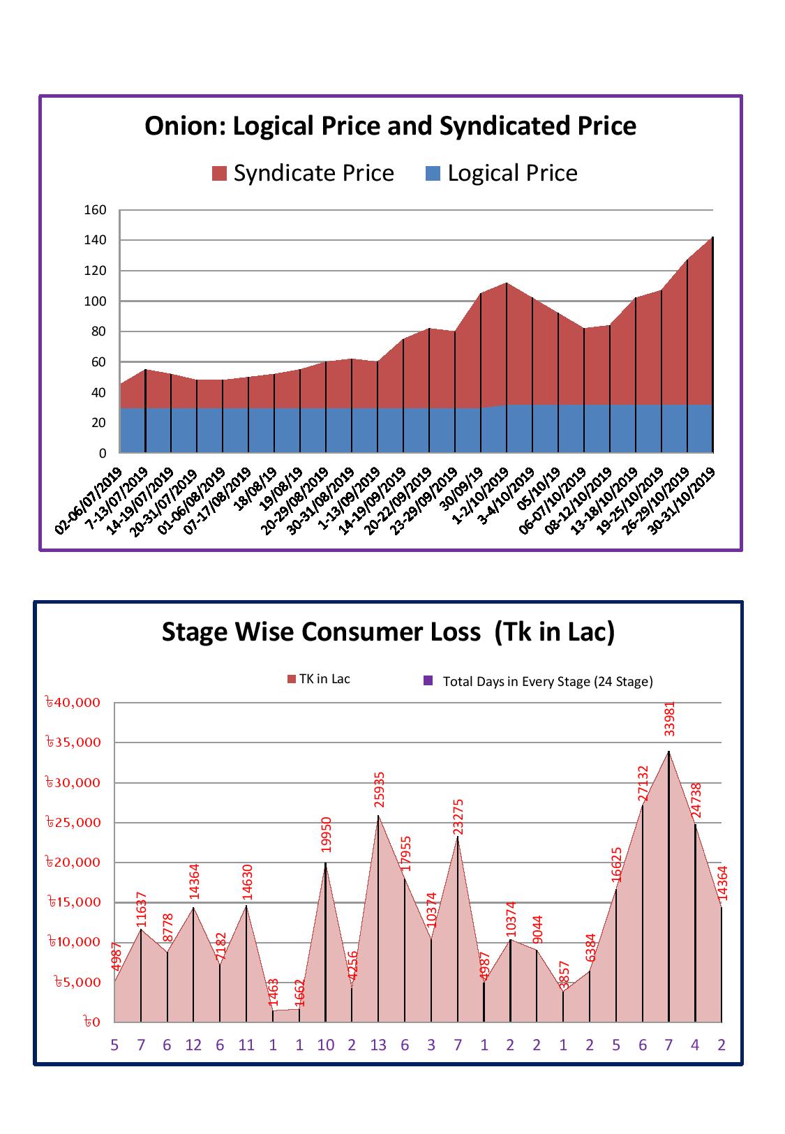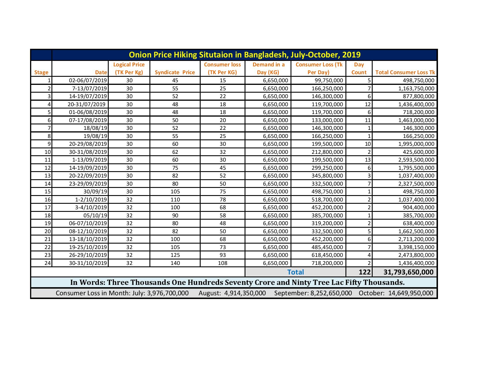 তিনি বলেন, গত ২ জুলাই থেকে ৩১ অক্টোবর পর্যন্ত সিেিন্ডকেট করে পেঁয়াজের দাম বাড়ানোয় গত চার মাসে ভোক্তার ক্ষতি হয়েছে তিন হাজার একশত উনাশি কোটি ছত্রিশ লাখ পঞ্চাশ হাজার টাকা। এর মধ্যে জুলাই মাসে তিনশত সাতানব্বই কোটি সাতষট্টি লাখ, আগস্ট মাসে চারশত একানব্বই কোটি তিতাল্লিশ লাখ পঞ্চাশ হাজার, সেপ্টেম্বর মাসে আটশত পঁচিশ কোটি ছাব্বিশ লাখ পঞ্চাশ হাজার এবং অক্টোবর মাসে চৌদ্দশত ছৌষট্টি কোটি নিরানব্বই লাখ পঞ্চাশ হাজার টাকা।